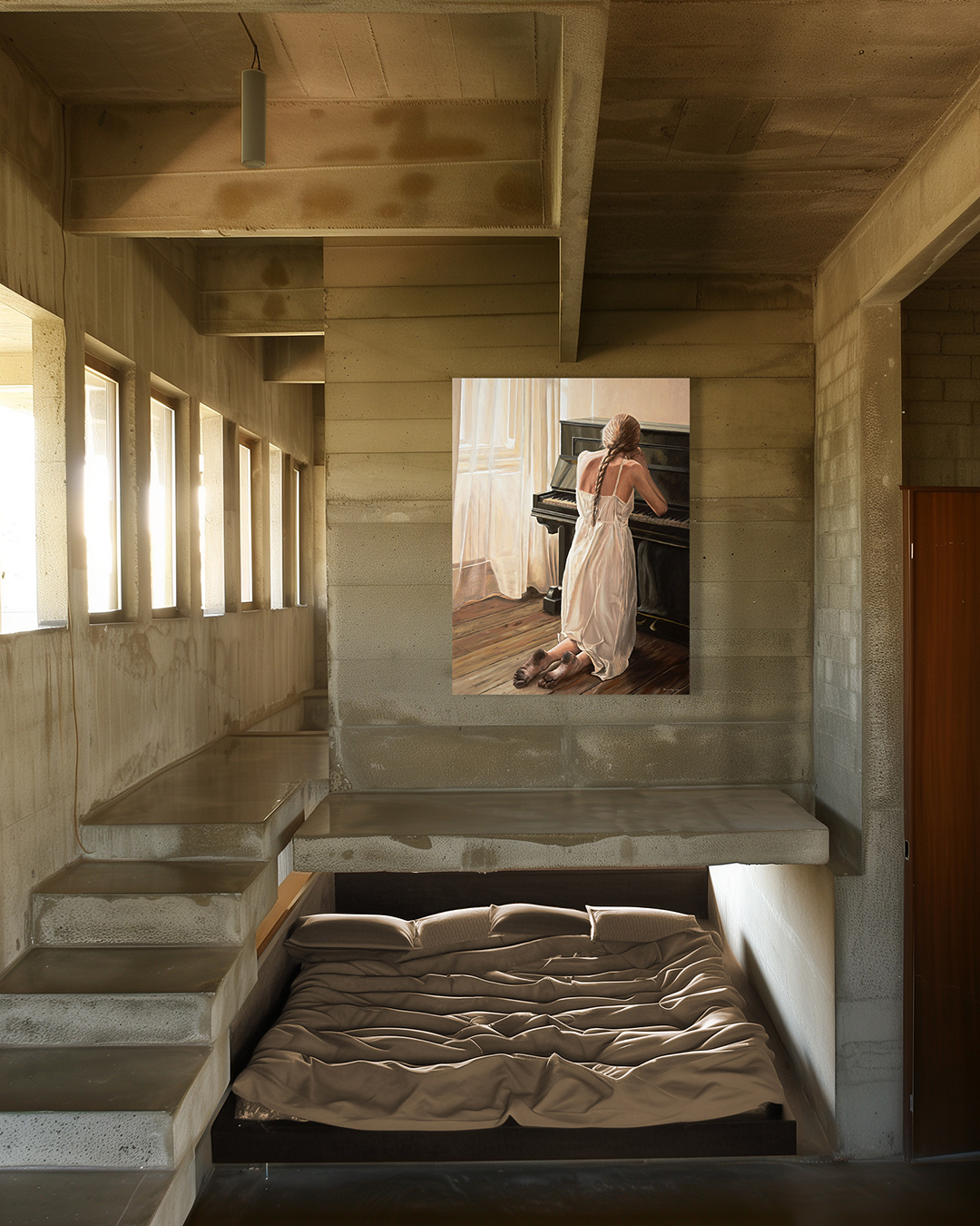 In the beginning there was only light and concrete. You put yourself in there, paused to enjoy their interaction, then took in the essentials. A bed big enough for day and night dreams, its sheets casually falling into adventurous dunes. Just above the alcove, other drapes echo uncharted territories: the house’s first piece of art plays on the tune of mystery.